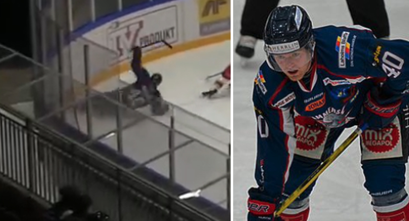 Han fick ett felskär, tappade balansen och åkte med hög fart in i sargen och blev liggandes med smärtor i flera minuter innan han fördes till sjukhuset i Halmstad.