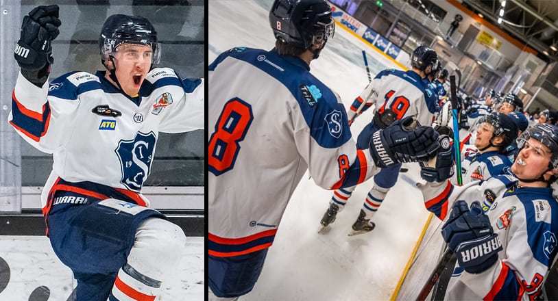 Glädje i Segeltorp säsongen 21/22 – det är ingen vanlig syn direkt. Men bottenlaget vann senaste matchen mot Tranås och laddar nu för att klara kontraktet i ligan. På bilderna syns Daniel Liw (lilla bilden) och Gabriel Söderqvist och Robin Carneholm. FOTO: ERIK HELLQUIST