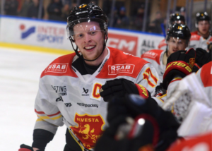 Alvestas lagkapten Hampus Andréen efter ett av målen. FOTO: TOBIAS JOSEFSSON/MJÖLBY HOCKEY