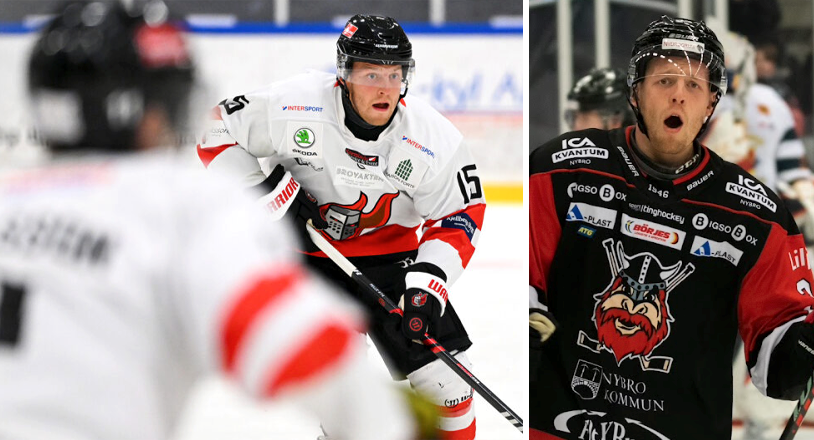 Pontus Karlsson i Nyköpings tröja – och på en jubelbild i Nybro i fjol. FOTO: ERIK KRUSE OCH HAMPUS GLIVING