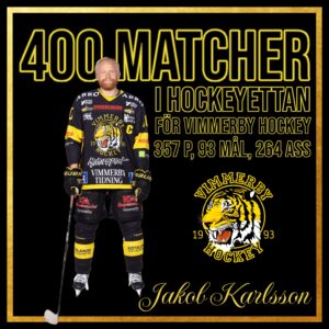 Vimmerby Hockey vill sÄklart uppmÀrksamma detta och gratulera vÄr lagkapten till de fantastiska 400 spelade matcherna för VH, och detta kommer uppmÀrksammas i samband med morgondagens match.