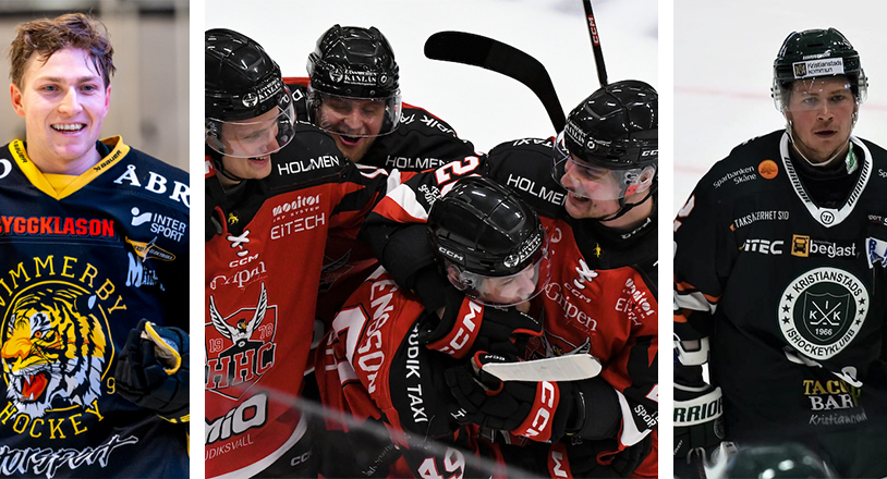 Elias Lindgren (Vimmerby), Hudiksvall (jubel efter ett mål i lördagens match) och Dennis Svensson (Kristianstad) – alla har de 2–0 i matchserierna i semifinalspelet. FOTO: MEIJER MEDIA, FLYWOOOD STUDIO, LARS SVENSSON