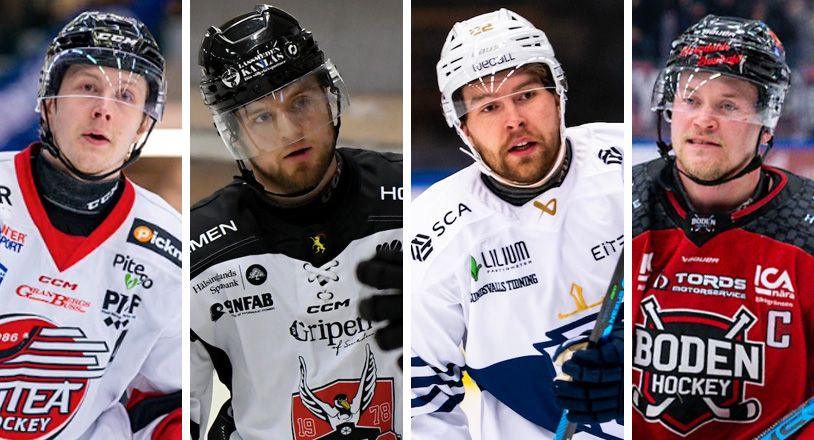 Petter Mäkitalo (Piteå), Adam Byström Johansson (Hudiksvall), Johan Lindholm (Sundsvall), Felix Dahlroth (Boden) – fyra profiler i norra serien. FOTO: OLIVER ÅSTRÖM OCH FLYWOOD STUDIO