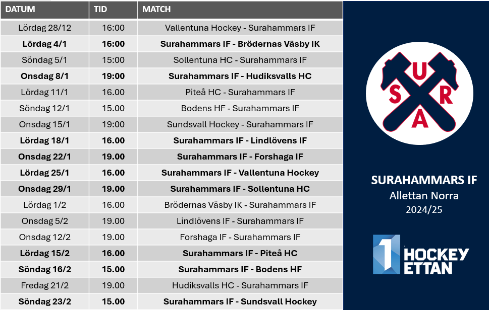 Under onsdagen spikades spelschemat för oss i Surahammars IF och övriga lag i Allettan Norra. Vi inleder på bortais mot Vallentuna den 28 december och avslutar hemma i Surahallen mot Sundsvall den 23 februari