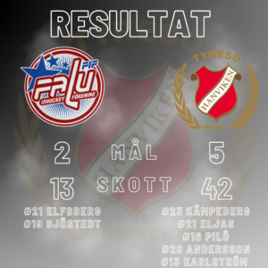 Matchen sluta 2-5 (0-3,1-1,1-1). Vi gör 3 mål i numerärt överläge och vinner skotten med 42-13. Målskyttar var Tim Kämpeberg, Eric Eljas, Filip Pilö, Alexander Andersson och David Karlström.